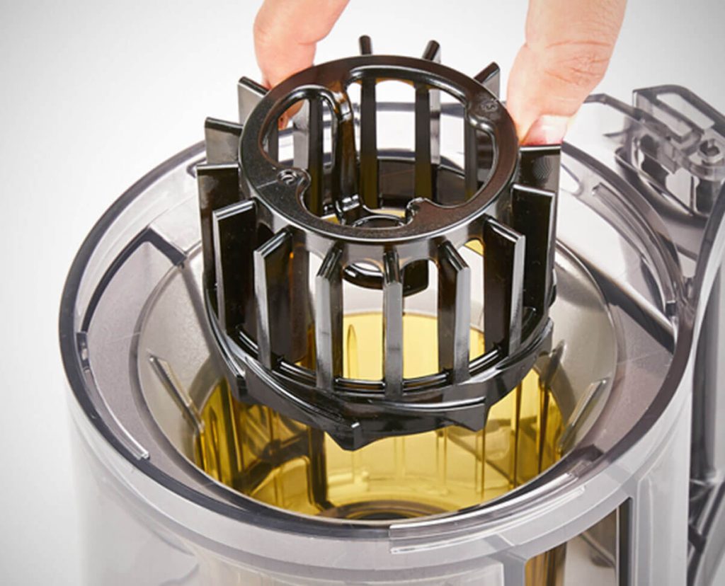 Thiết kế cải tiến này cho phép bạn cho toàn bộ sản phẩm cần ép vào khoang chứa. Khoang chứa bao gồm một lưỡi dao 3 trong 1 quay liên tục sẽ thực hiện phần lớn công việc, lưỡi dao thông minh này sẽ tự động cắt nhỏ rau, củ, quả,… thành từng miếng đều nhau sau đó đưa xuống hệ thống ép bên dưới với tốc độ nhanh chóng.